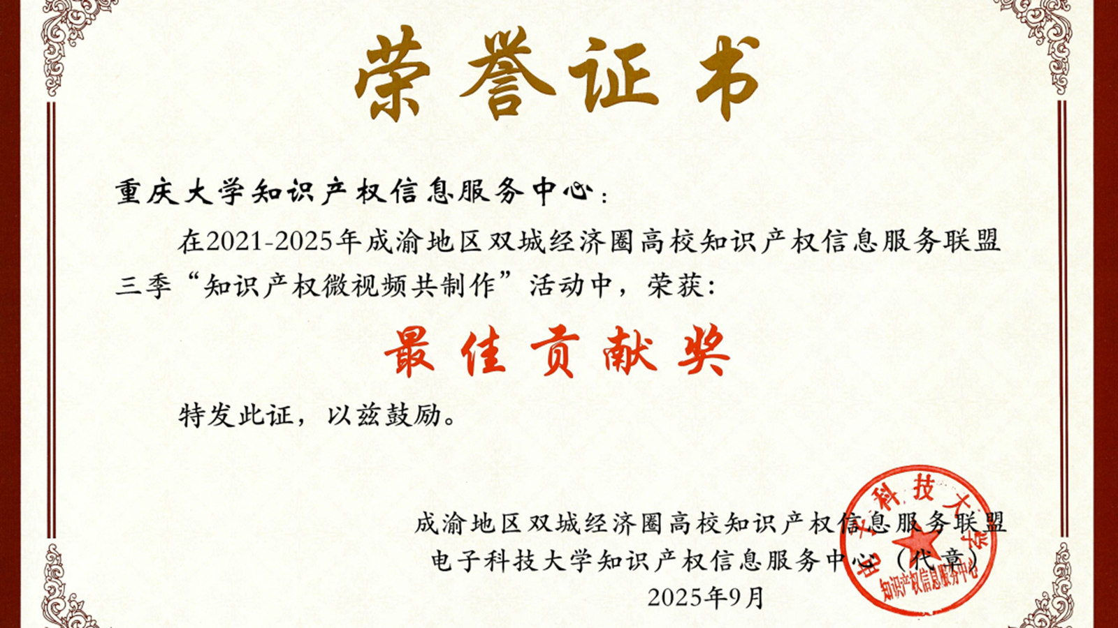 10月29日,“2025年成渝地区双城经济圈高校知识产权信息服务联盟年会暨高校知识产权信息服务工作研讨会”在四川大学召开。会上,重庆大学知识产权信息服务中心报送的微视频共制作作品荣获一等奖1项和二等奖2项,同时中心还凭借在知识产权科普宣传工作中的突出贡献,获得了最佳贡献奖的殊荣。