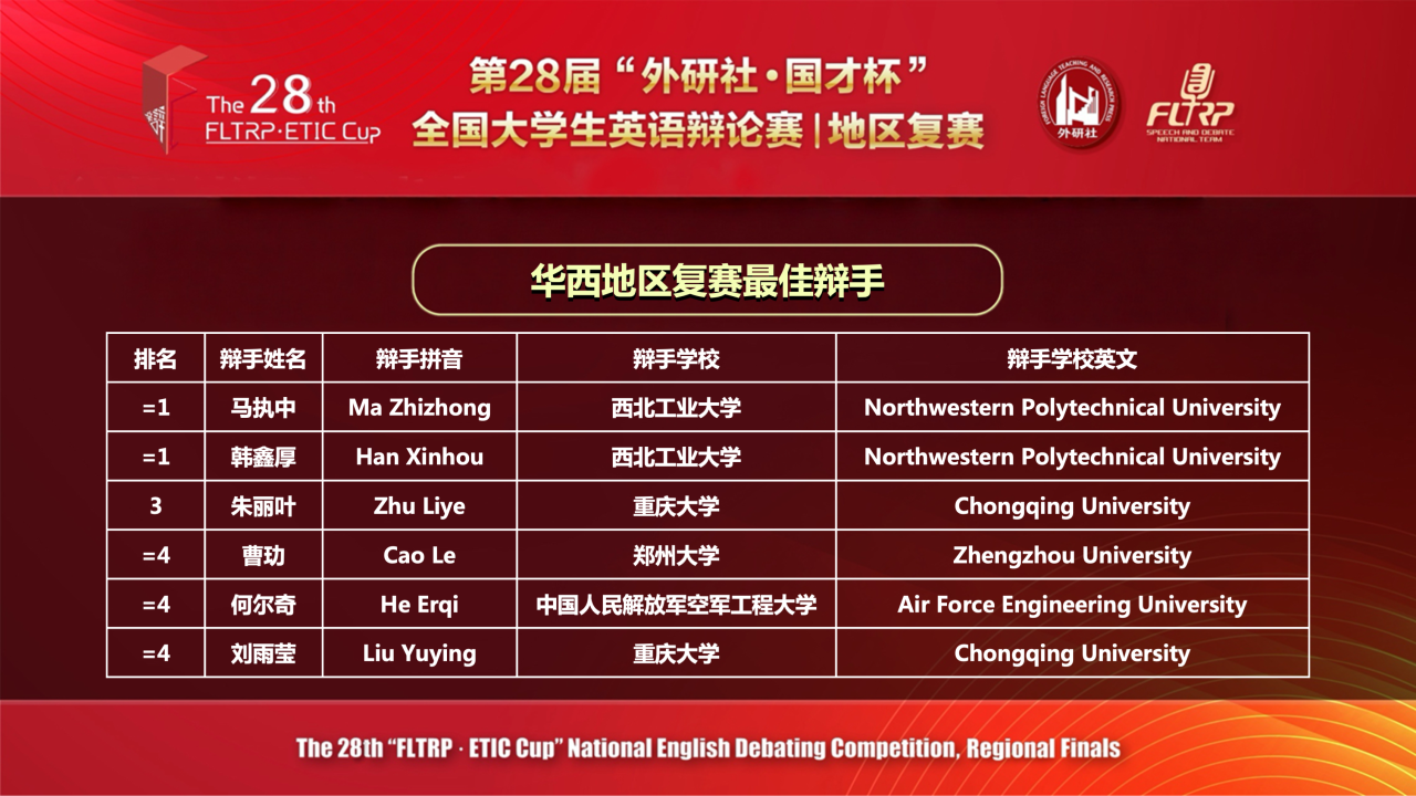 重庆大学两支队伍荣获第28届“外研社•国才杯”全国大学生英语辩论赛华西赛区复赛金奖