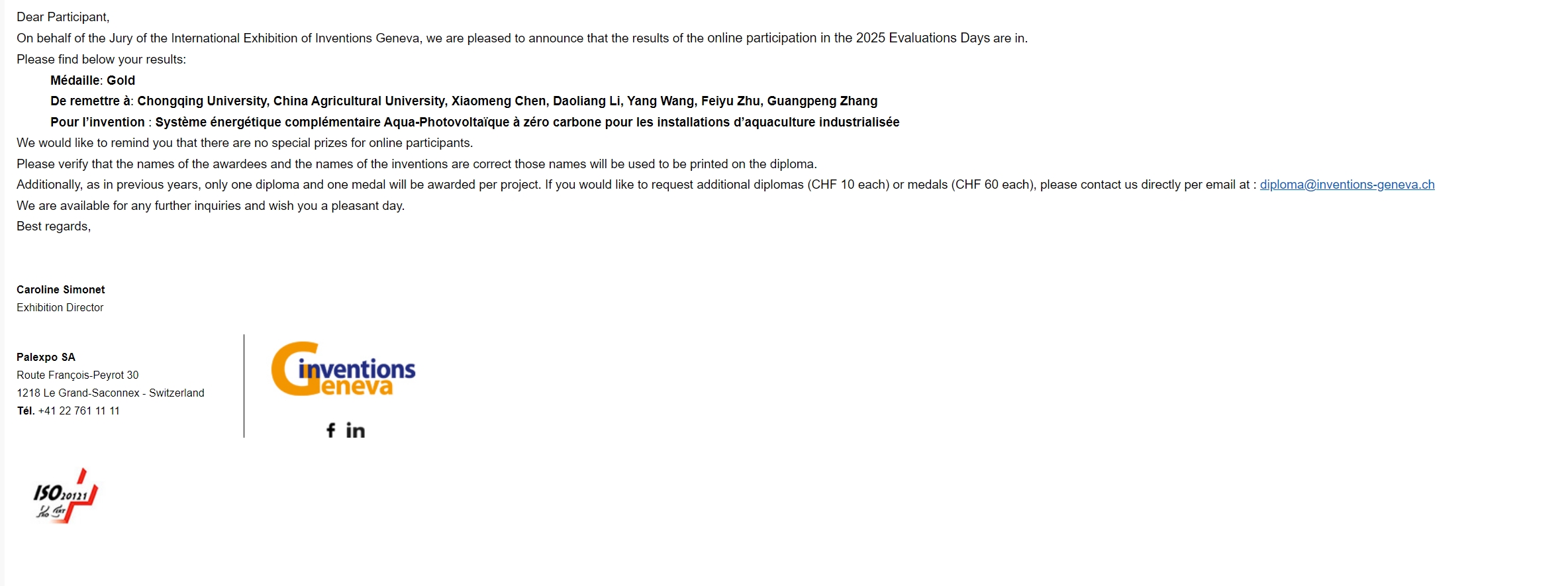 2025年5月12日,重庆大学建筑城规学院陈肖萌副教授的创新项目“面向工厂化渔业养殖设施的零碳渔光互补系统”(Zero-Carbon Aqua-Photovoltaic Complementary Energy System for Industrialized Aquaculture Facilities)在50届日内瓦国际发明展上斩获金奖(Gold Medal)。该项目依托重庆大学和中国农业大学国家数字渔业创新中心,将光伏直流电力系统直接用于工厂化设施渔业温室环境控制,利用养殖鱼代谢节律波动和温室内土壤-水的热-电协同储能机理,实现渔业光伏电力系统“源-储-荷”柔性调控策略,该技术显著提升光伏波动电力的自利用率,为农业光伏系统的就地柔性消纳提供新的解决路径和解决方法。