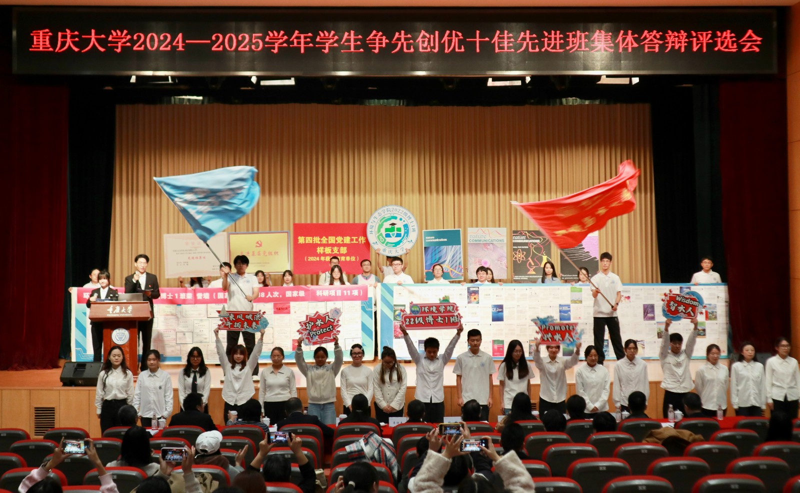 十佳先进班集体答辩评选现场,14个候选班级通过答辩陈述、情景再现、才艺展示等多元形式,呈现了班集体过去一学年在思想建设、科研创新、学生工作等德智体美劳各领域的亮眼成果。经过评选,生物工程学院2022级生物医学工程1班、公共管理学院2023级理论经济学硕士班、环境与生态学院2022级博士1班等10个班级获评“重庆大学十佳先进班集体”。