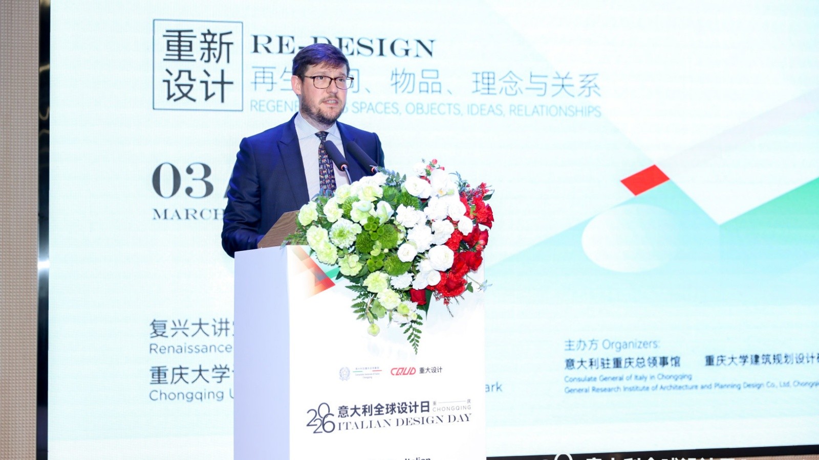 2026年重庆站意大利设计日设计大使、西交利物浦大学副教授、中意城市更新中心主任罗伯特·㰴哒(Roberto Podda)进行了主题演讲,围绕本届设计日的核心主题进行了深入阐述。