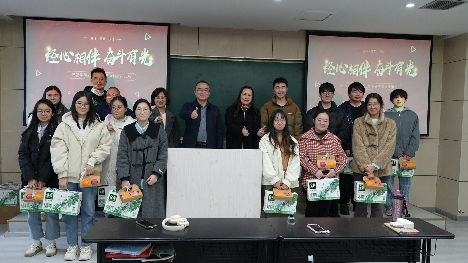 12月9日下午,经济与工商管理学院在沙坪坝校区A校园学院大楼301教室举办“经心相伴,奋斗有光”考研慰问活动。学院党委书记谭英双,党委副书记张燕,副院长陈逢文、钱丽萍,办公室主任陆位忠等领导参加,活动由本科2022级辅导员王毅文主持。