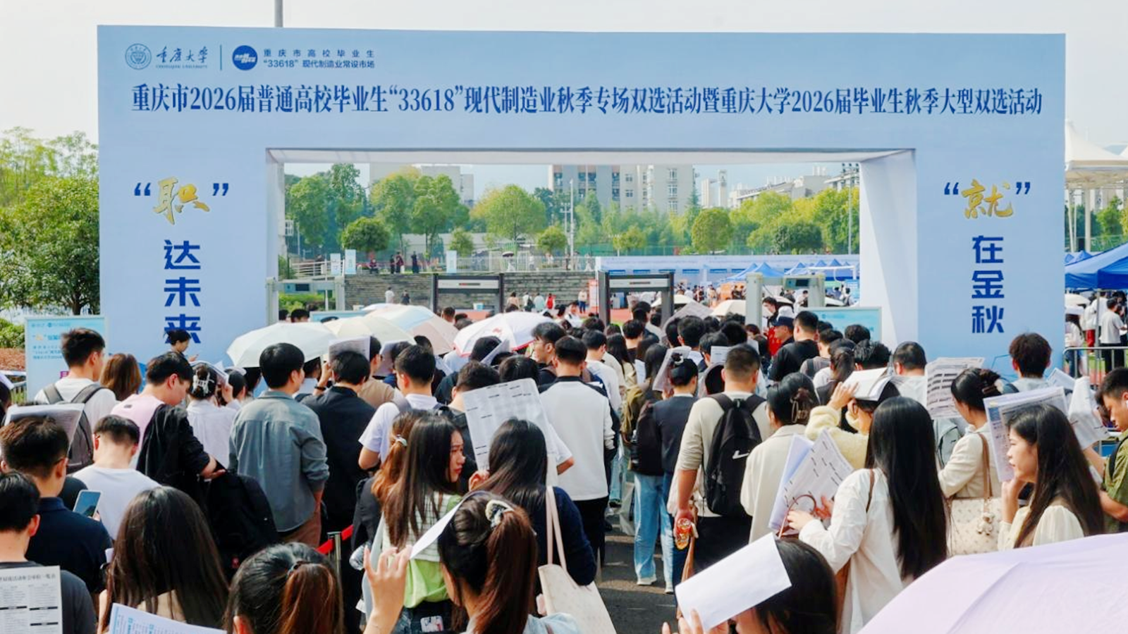 10月16日,重庆市2026届普通高校毕业生“33618”现代制造业秋季专场双选活动暨重庆大学2026届毕业生秋季大型双选活动,在科学城校区(虎溪校园)体育场举行。580家用人单位参会,提供超3万个优质就业岗位,吸引校内外1.3万余名毕业生入场咨询求职。