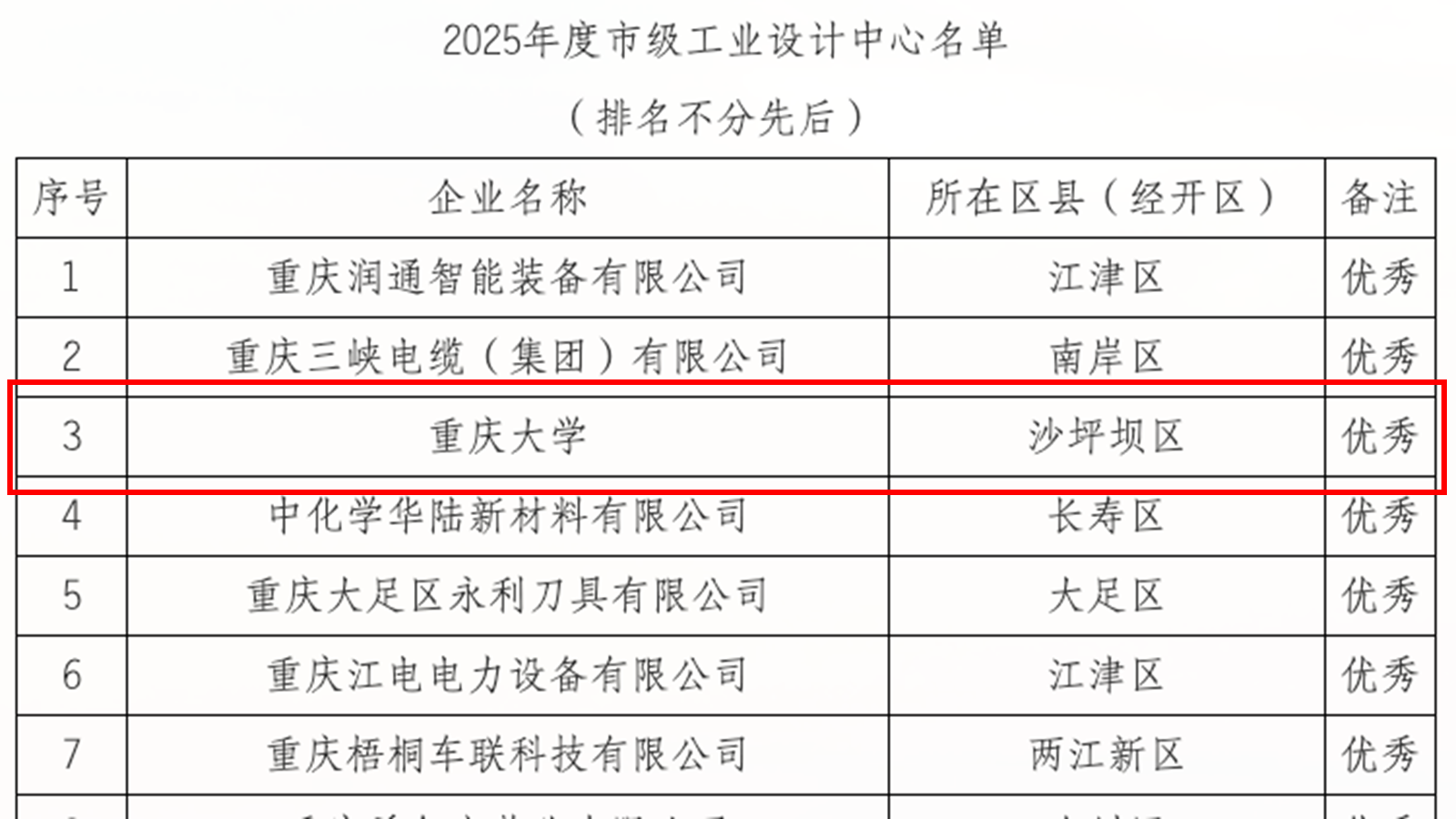 近日,重庆市经济和信息化委员会发布《关于公布2025年度市级工业设计中心认定及复核名单的通知》,重庆大学入选2025年度市级工业设计中心名单。