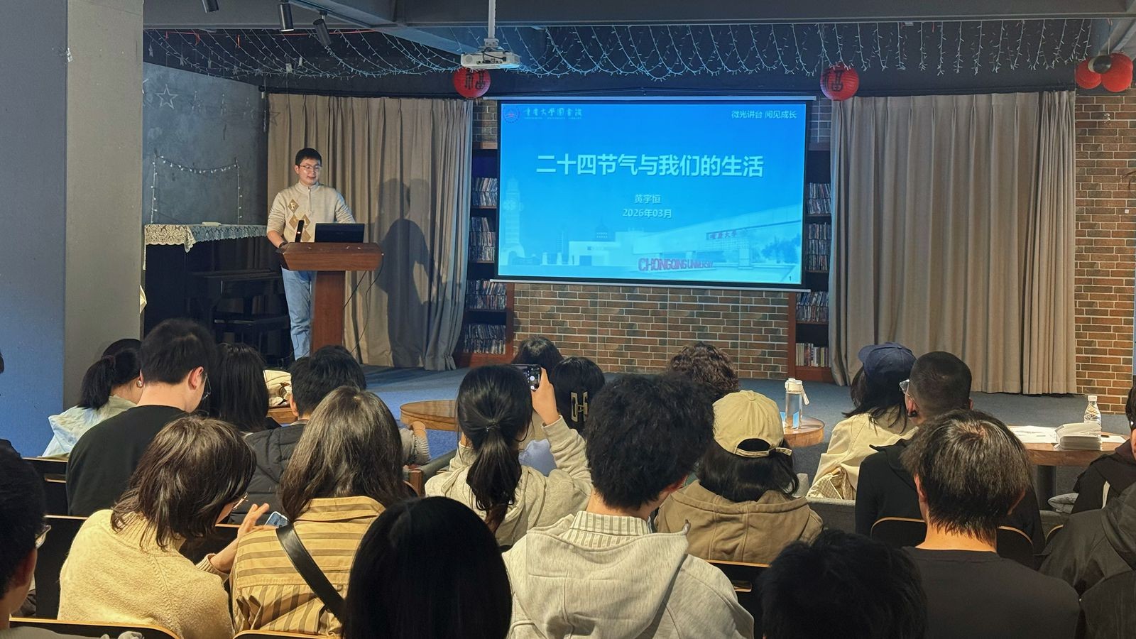 3月12日下午,图书馆全新打造的阅读品牌活动——“微光讲台 阅见成长”在重庆大学沙坪坝校区A校园声音图书馆拉开序幕。首期分享会以“二十四节气与我们的生活”为主题,邀请了环境与生态学院2023级环境科学与工程专业博士生黄宇恒担任主讲人,重庆大学图书馆党总支书记何栎出席活动。