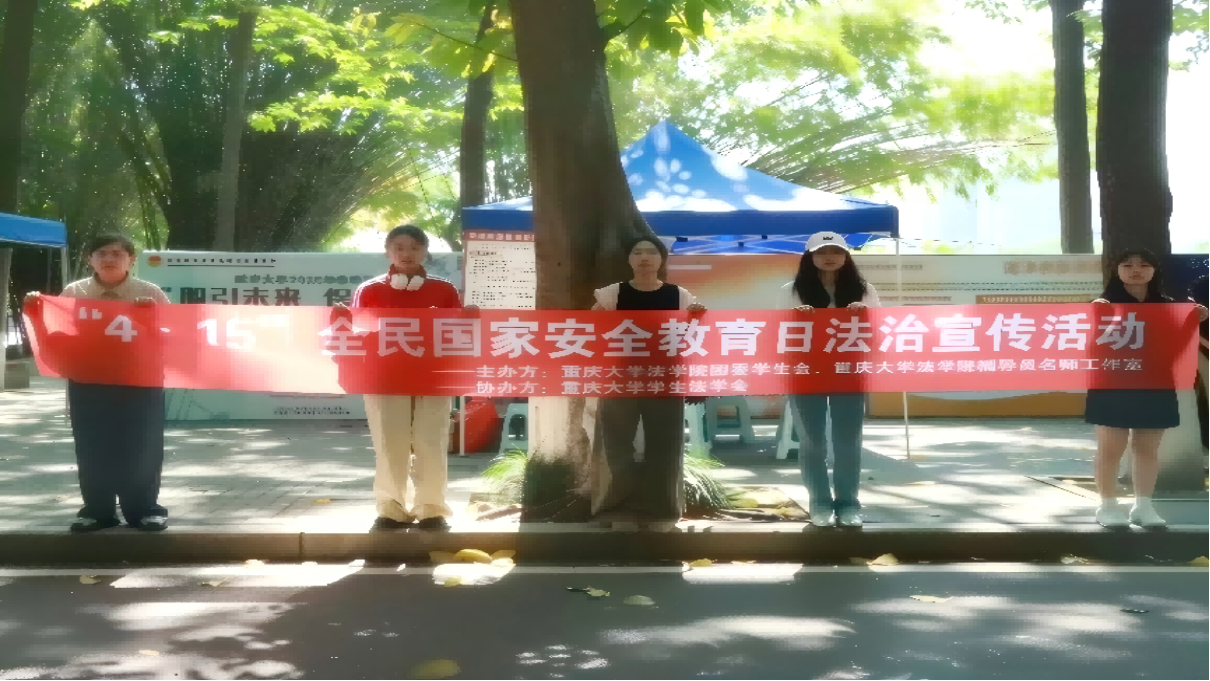 4月18日,由重庆大学法学院团委学生会、重庆大学法学院辅导员名师工作室主办,重庆大学学生法学会协办的全民国家安全教育日法治宣传活动在沙坪坝校区A校园小竹林举办。
